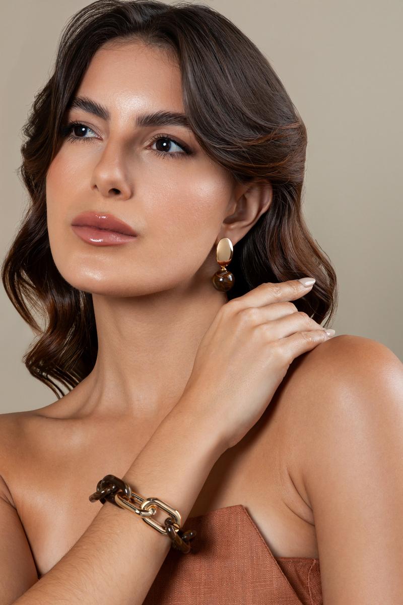 Pulseira ajustável em resina marrom com elos dourados.