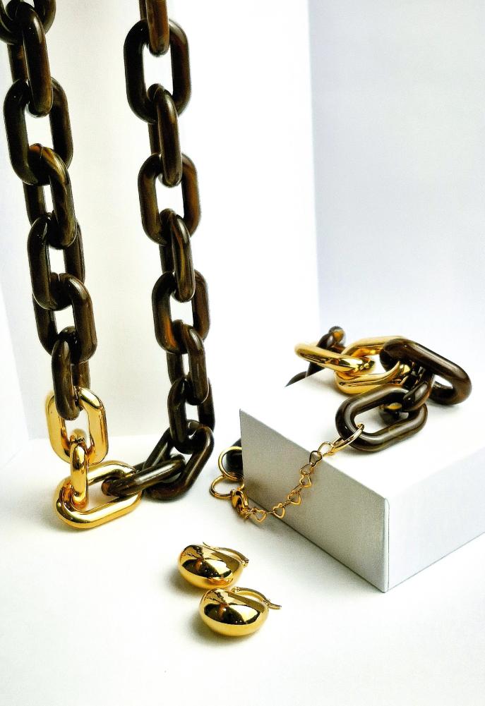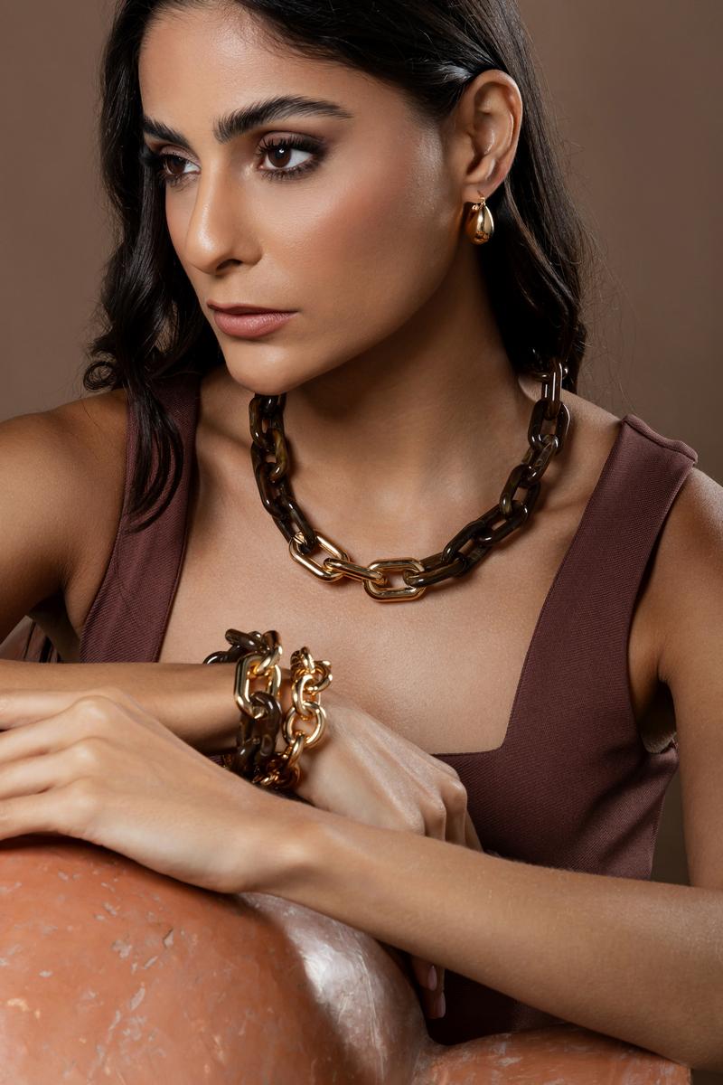 Colar de 50 cm em resina marrom com elos dourados.