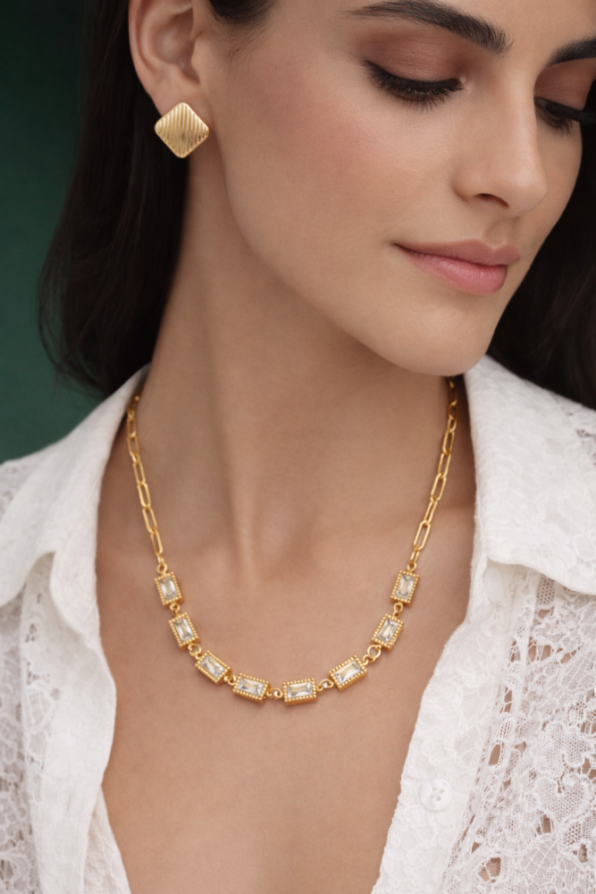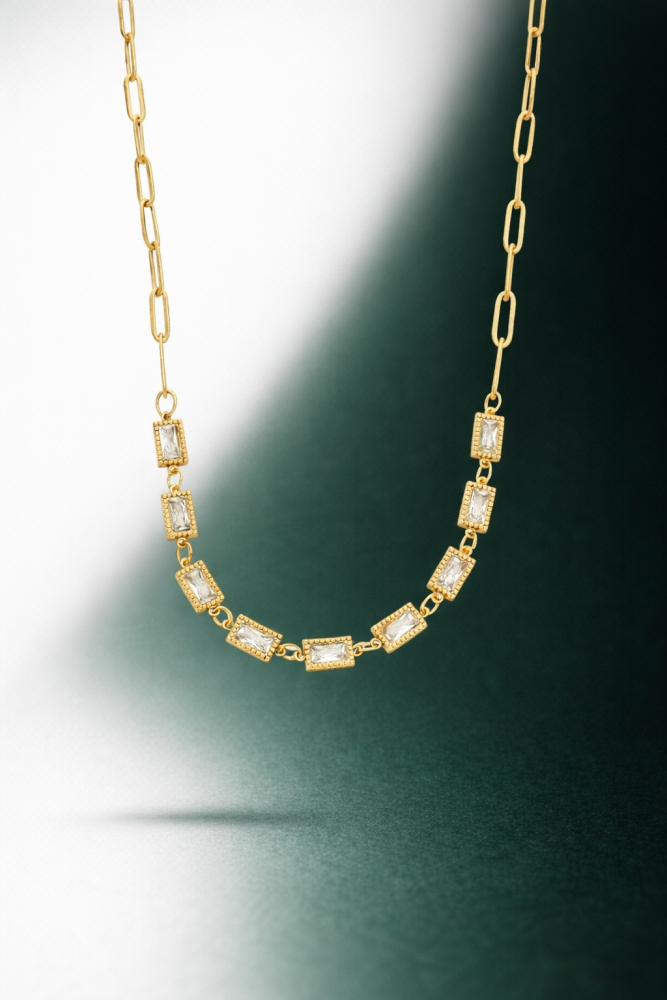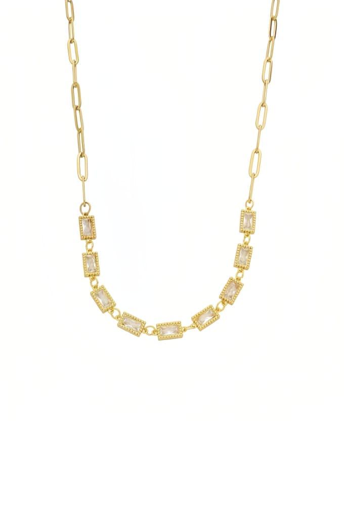 COLAR COM ELOS E PEDRAS BAGUETE CRISTAL EM AÇO INOX DOURADO CO810-AD
