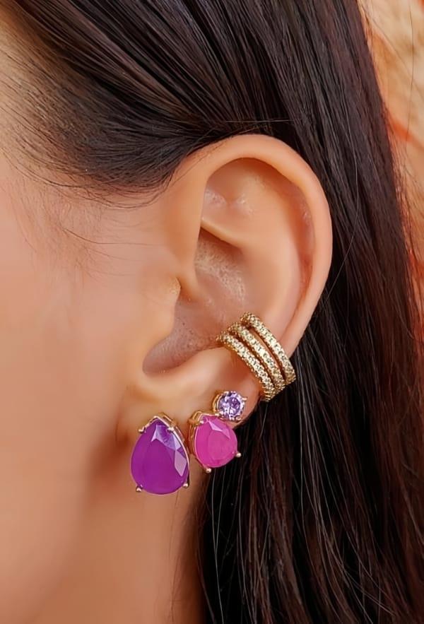 Brinco com zircônia ametista no ouro Zircônia ametista redondo cravejado Tamanho: aproximadamente 5mm
