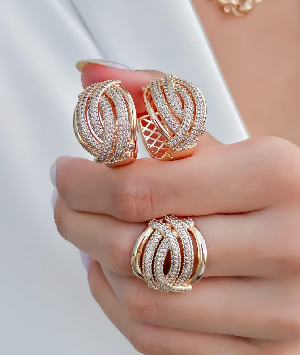 CONJUNTO ANEL E BRINCO ELOS CRAVEJADO, COM ZIRCÔNIA BRANCA