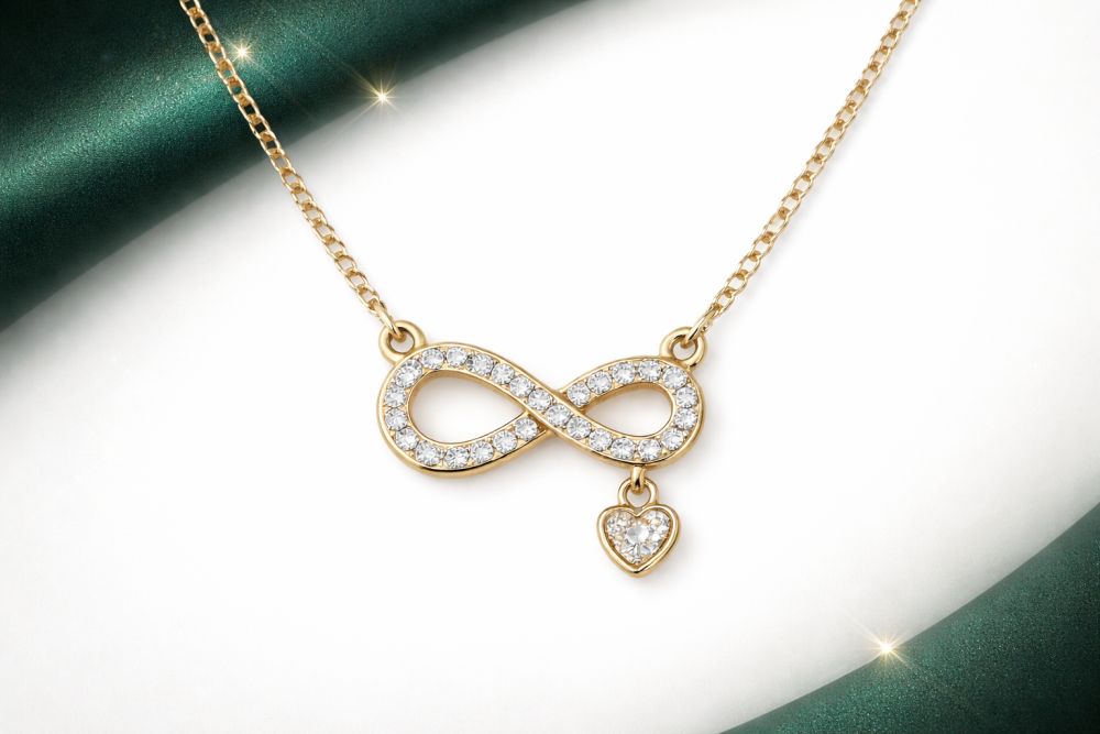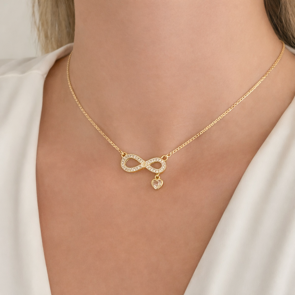 Colar delicado com símbolo do infinito cravejado em microzircônias, trazendo brilho sofisticado e significado eterno. O detalhe do mini coração adiciona um toque romântico e exclusivo à peça. Ideal para composições elegantes ou uso diário com muito estilo.