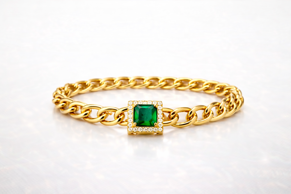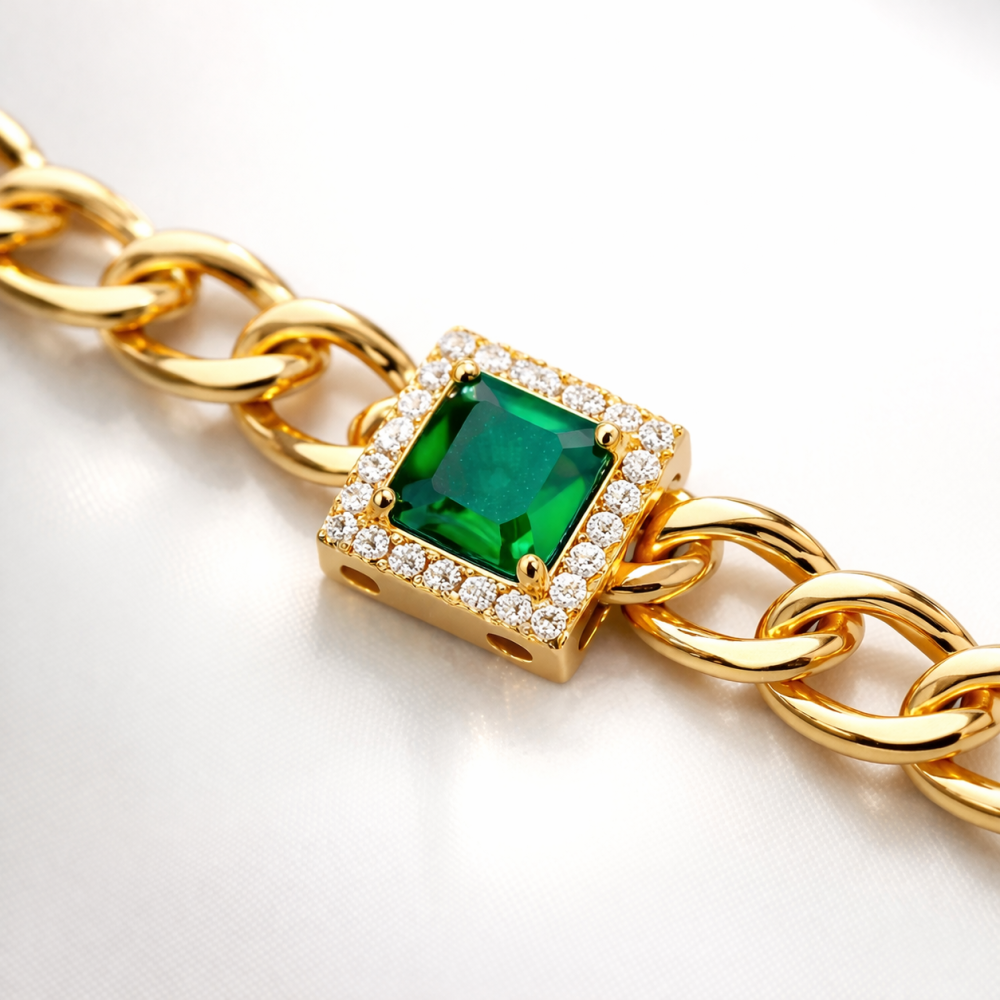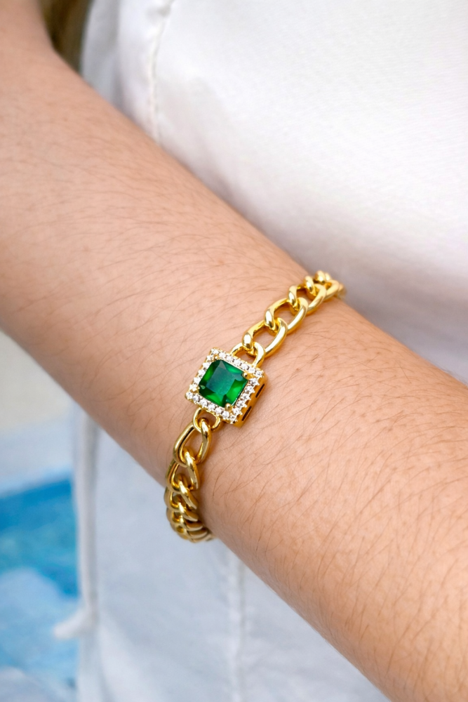 Pulseira Elos com Pingente Quadrado Esmeralda