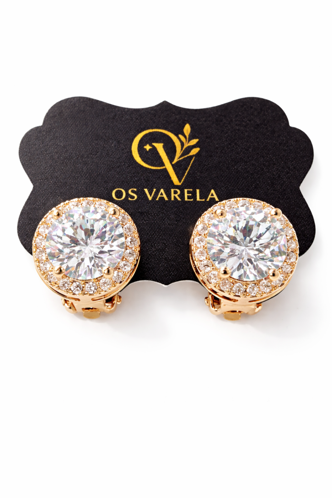 Brinco ponto de luz, pedra central zircônia na cor transparente com borda dourada e microzircônias cravejadas.