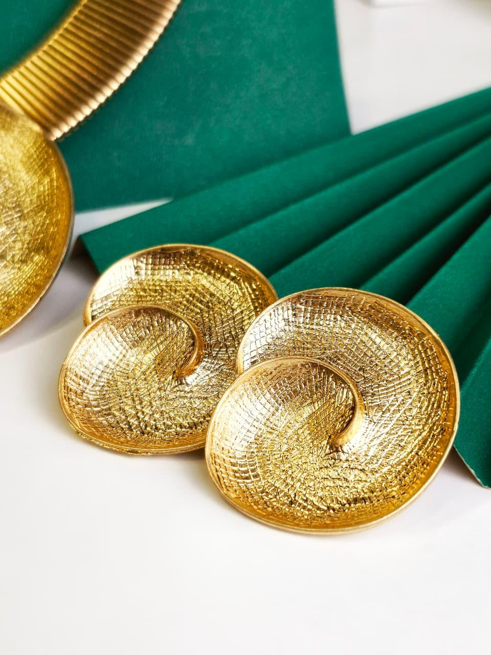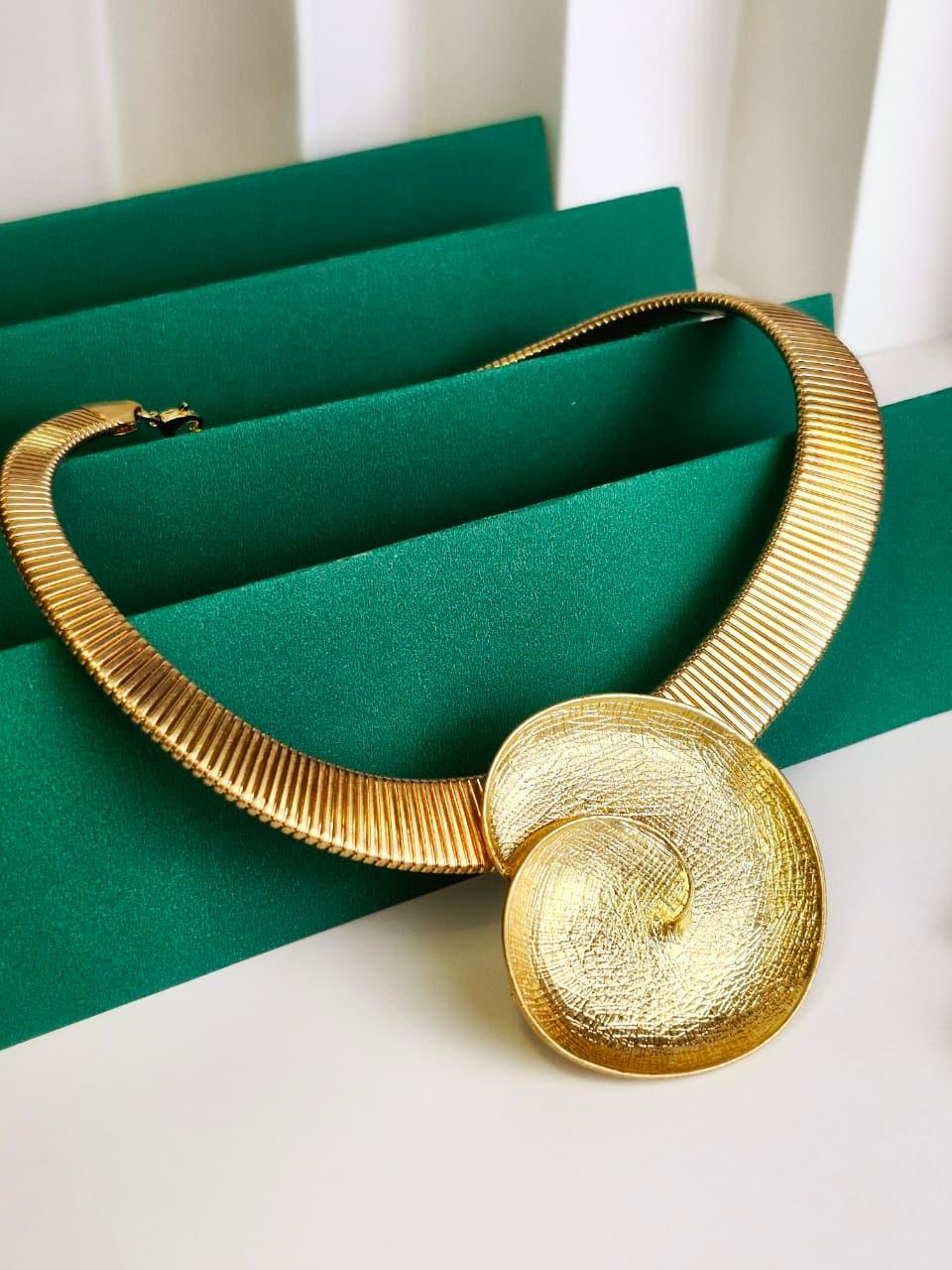 traz um colar estrutural e brincos espirais com superfície trabalhada e brilho sutil.