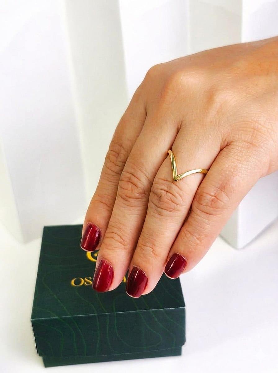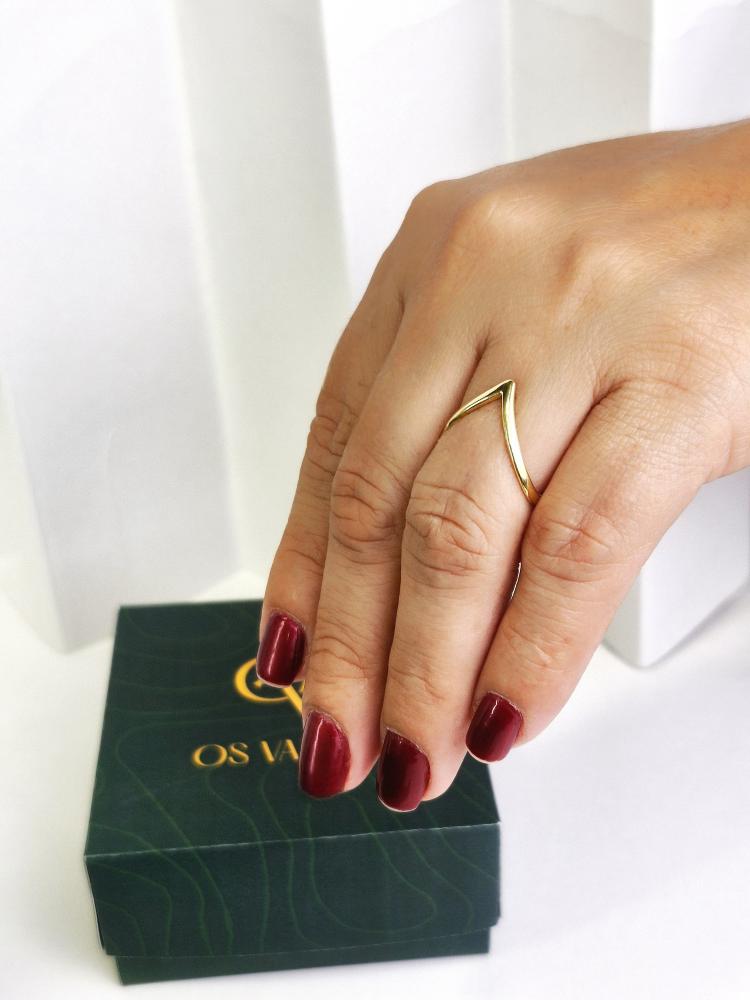 Anel minimalista em formato V, com acabamento polido e design moderno