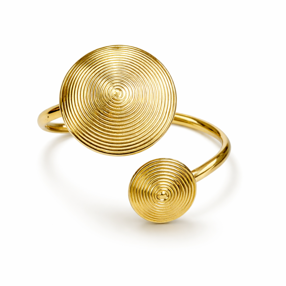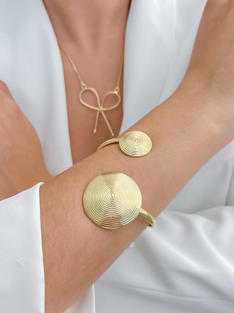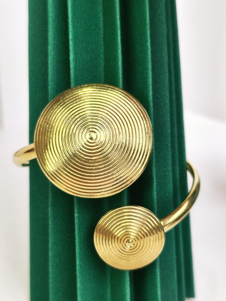 Elegância e design contemporâneo se encontram neste bracelete marcante. A peça apresenta dois discos com delicadas linhas concêntricas em relevo, criando um efeito visual sofisticado que reflete a luz de forma única.