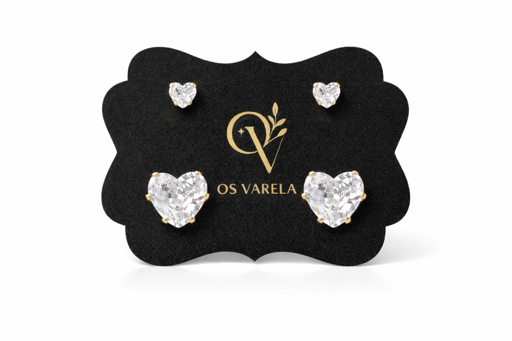 conjunto possui dois pontos de luz em zircônia e dois brincos em formato de coração com pedra lapidada, que trazem um toque romântico e sofisticado ao visual.