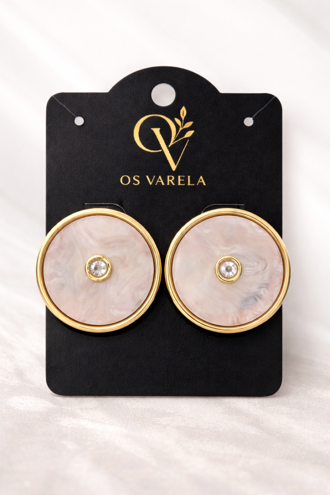 Brinco sofisticado em formato circular, com acabamento em dourado polido, que traz um toque de luxo e elegância à peça. Seu centro é preenchido com resina marmorizada na tonalidade rosé claro (rosa suave), criando um efeito delicado e moderno. No centro, conta com uma pedra de zircônia cristal, que adiciona brilho e destaque ao design.