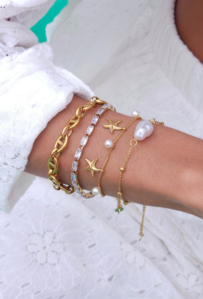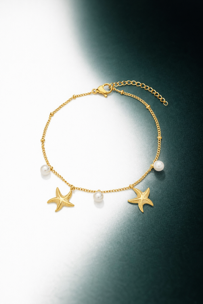 PULSEIRA ESTRELA DO MAR COM PÉROLAS EM AÇO INOX DOURADO PM522-AD