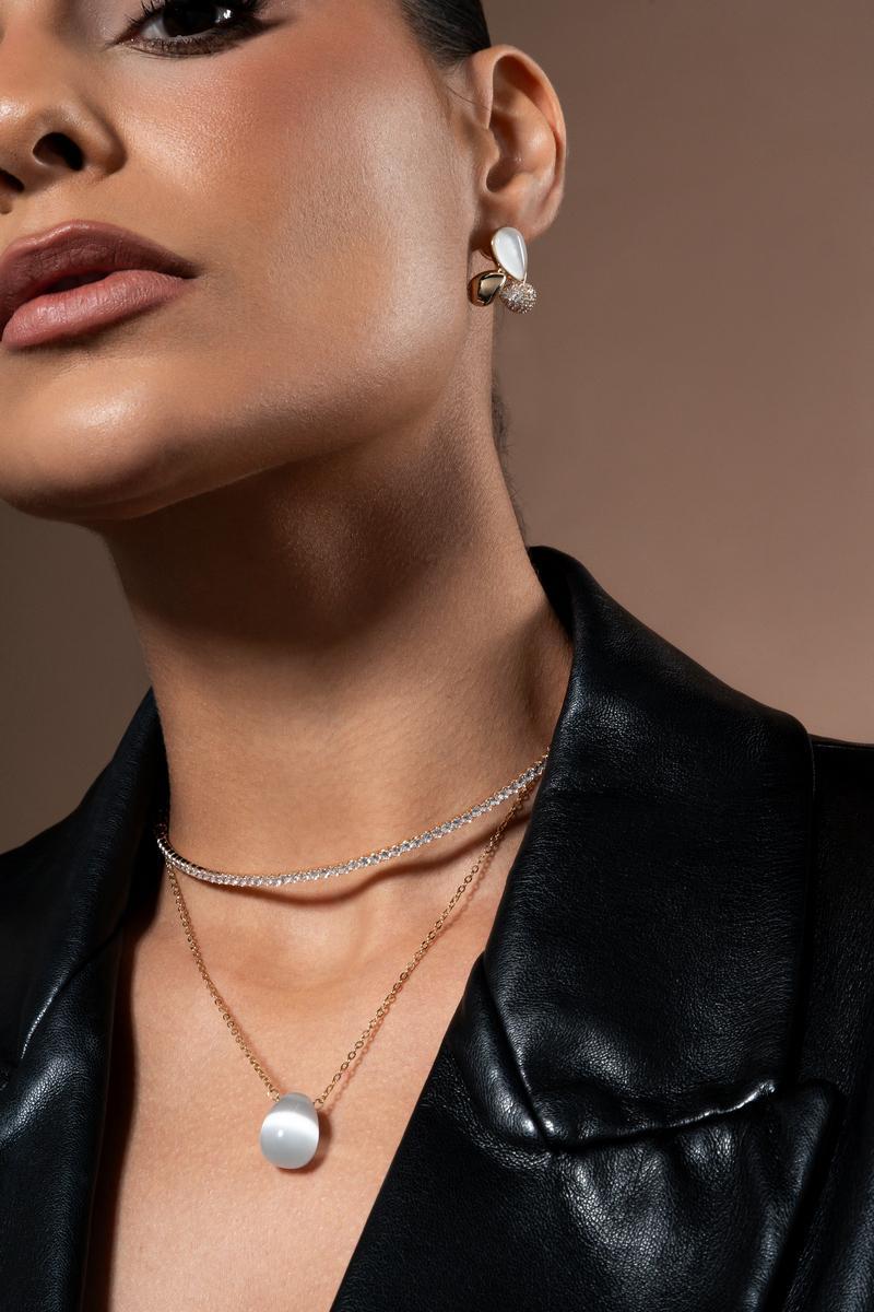 Colar com elos delicados e pingente em formato de gota com pedra olho de gato.