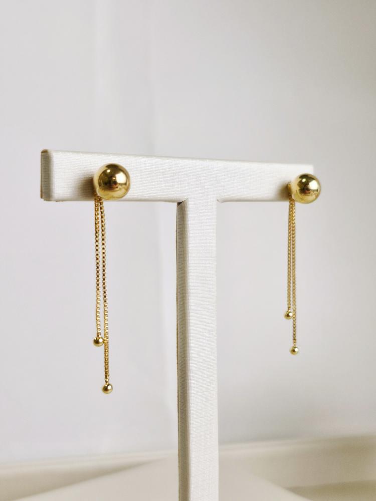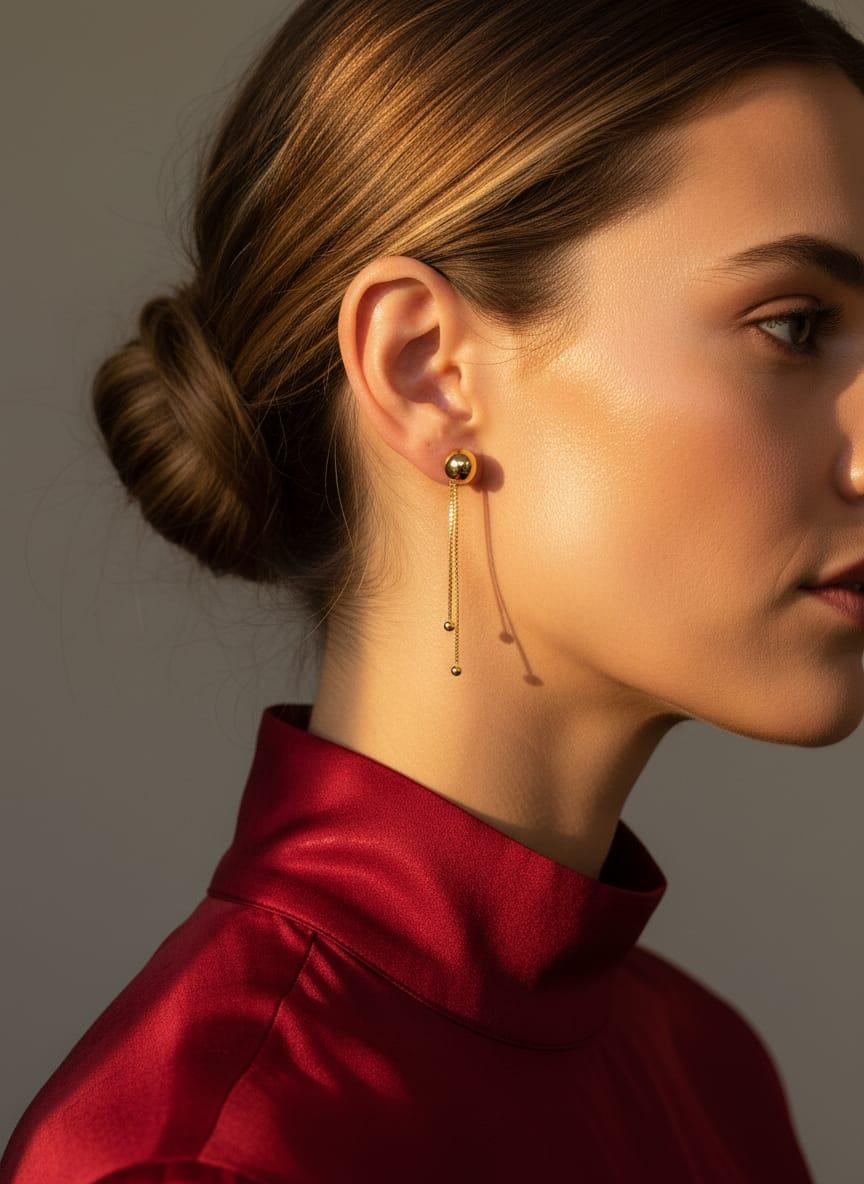 Brinco elegante em design minimalista, composto por um ponto de luz esférico em acabamento dourado polido, do qual pendem duas correntes finas com delicadas esferas nas extremidades. Leve e sofisticado, proporciona movimento sutil e brilho discreto, ideal para compor looks modernos e refinados, tanto para o dia quanto para a noite.